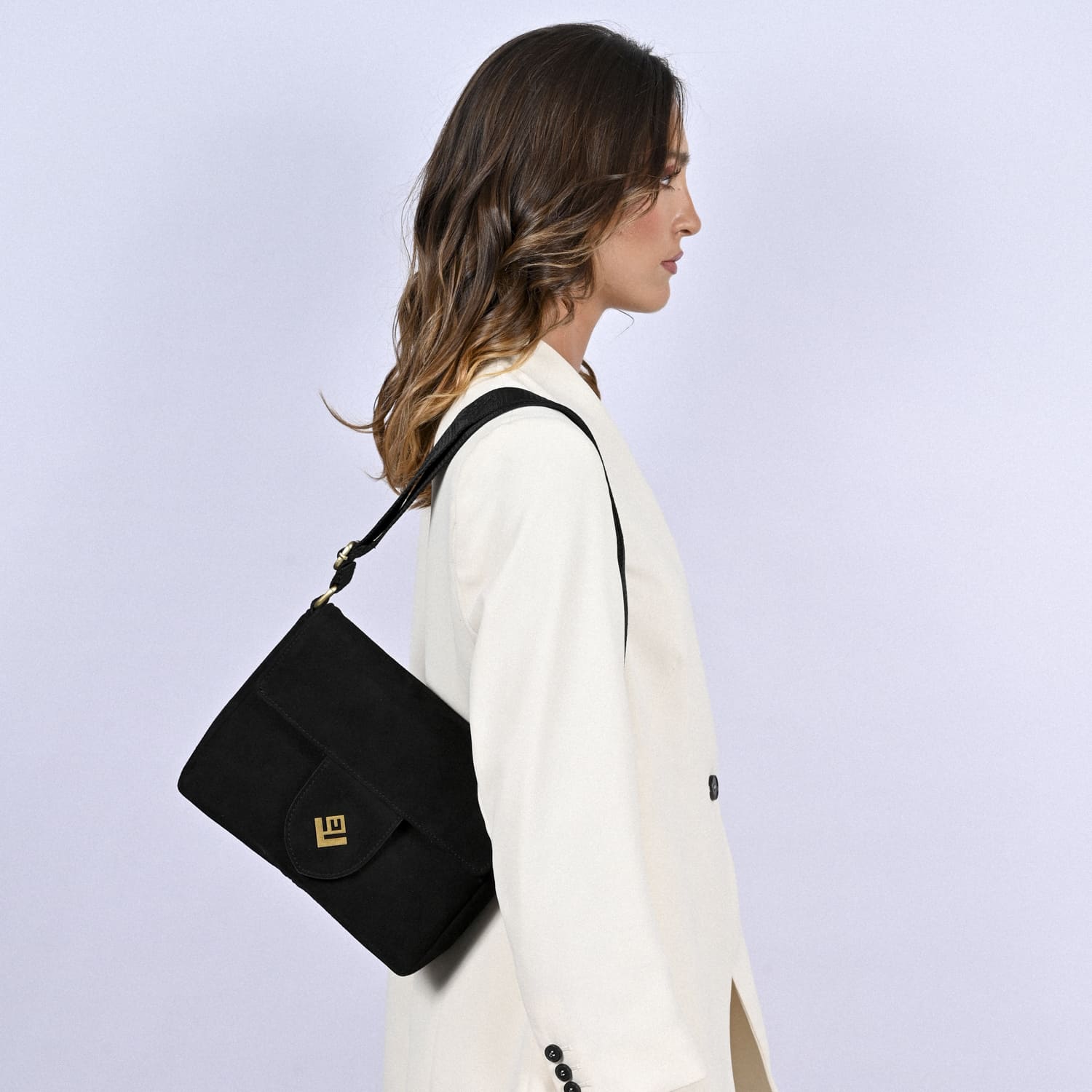 Η Irma είναι η τσάντα ώμου (shoulder bag) που δεν πρέπει να λείπει από τη συλλογή σου. Κλασσικός, λιτός σχεδιασμός ιδανικός για όλα σου τα καθημερινά outfits. Ο μεγάλος αυξομειούμενος υφασμάτινος ιμάντας σου επιτρέπει να τη φοράς χιαστί για ένα πιο ιδιαίτερο στυλ και περισσότερη ασφάλεια. Κατασκευασμένη από εξαιρετικής ποιότητας 100% recycled suede leather. Στο εσωτερικό της θα βρεις μία τσέπη και υφασμάτινη φόδρα, ενώ κλείνει με suede leather καπάκι και μαγνήτη για περισσότερη ασφάλεια.3