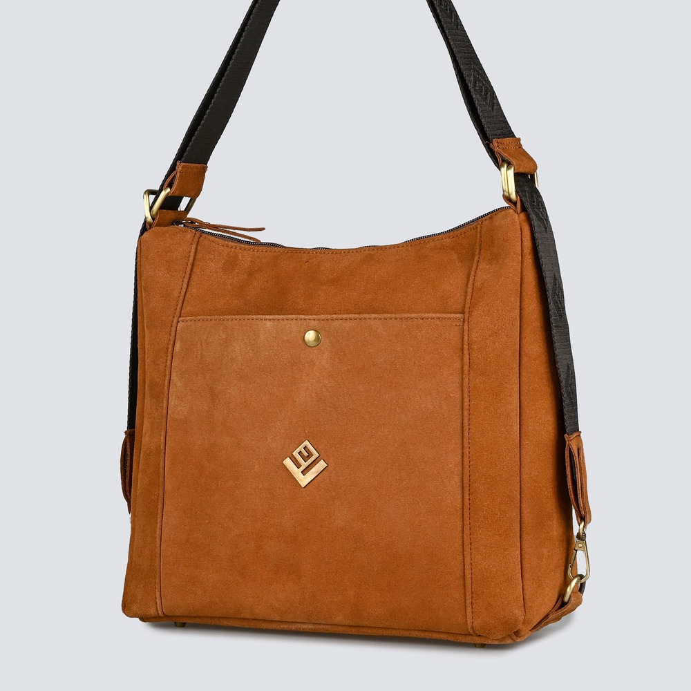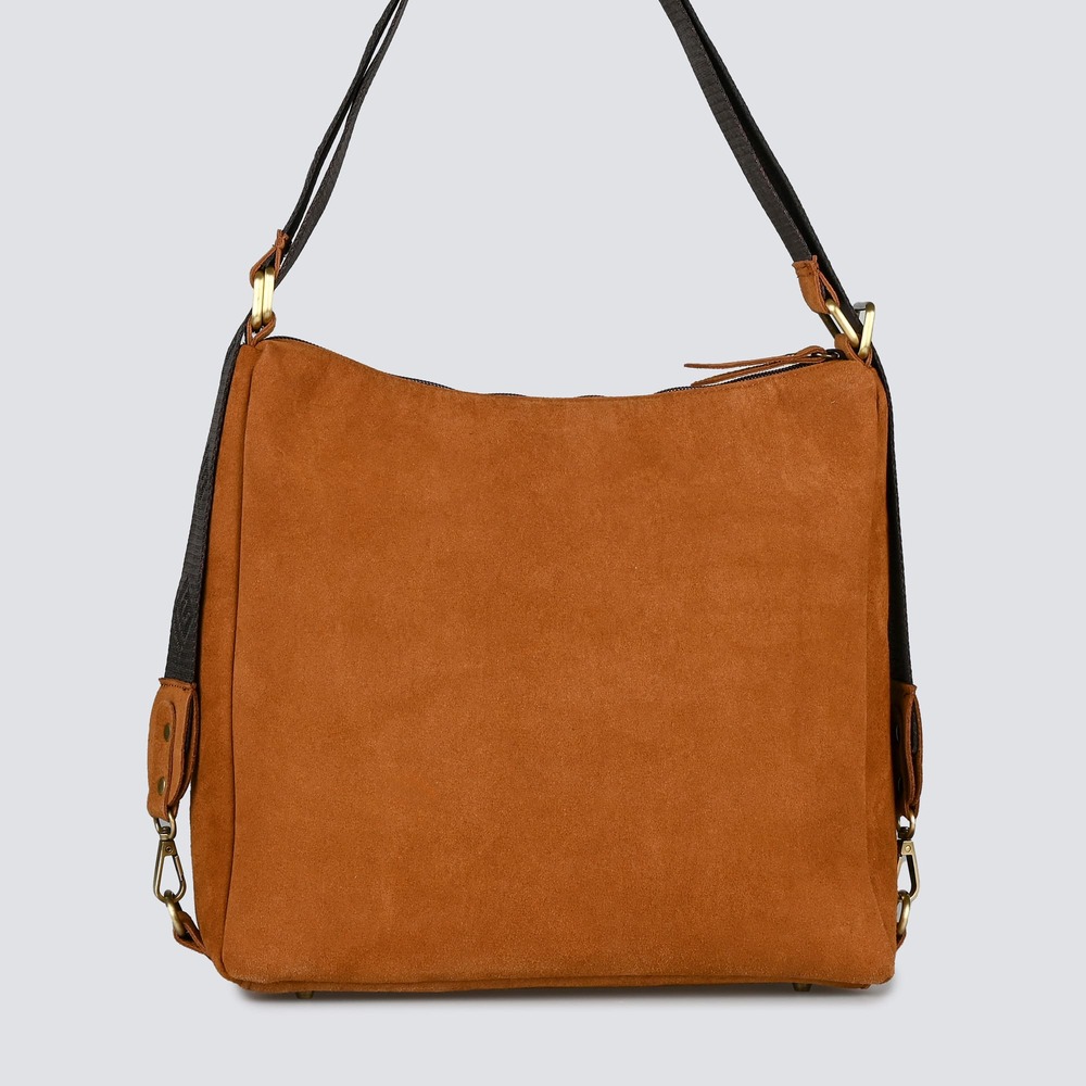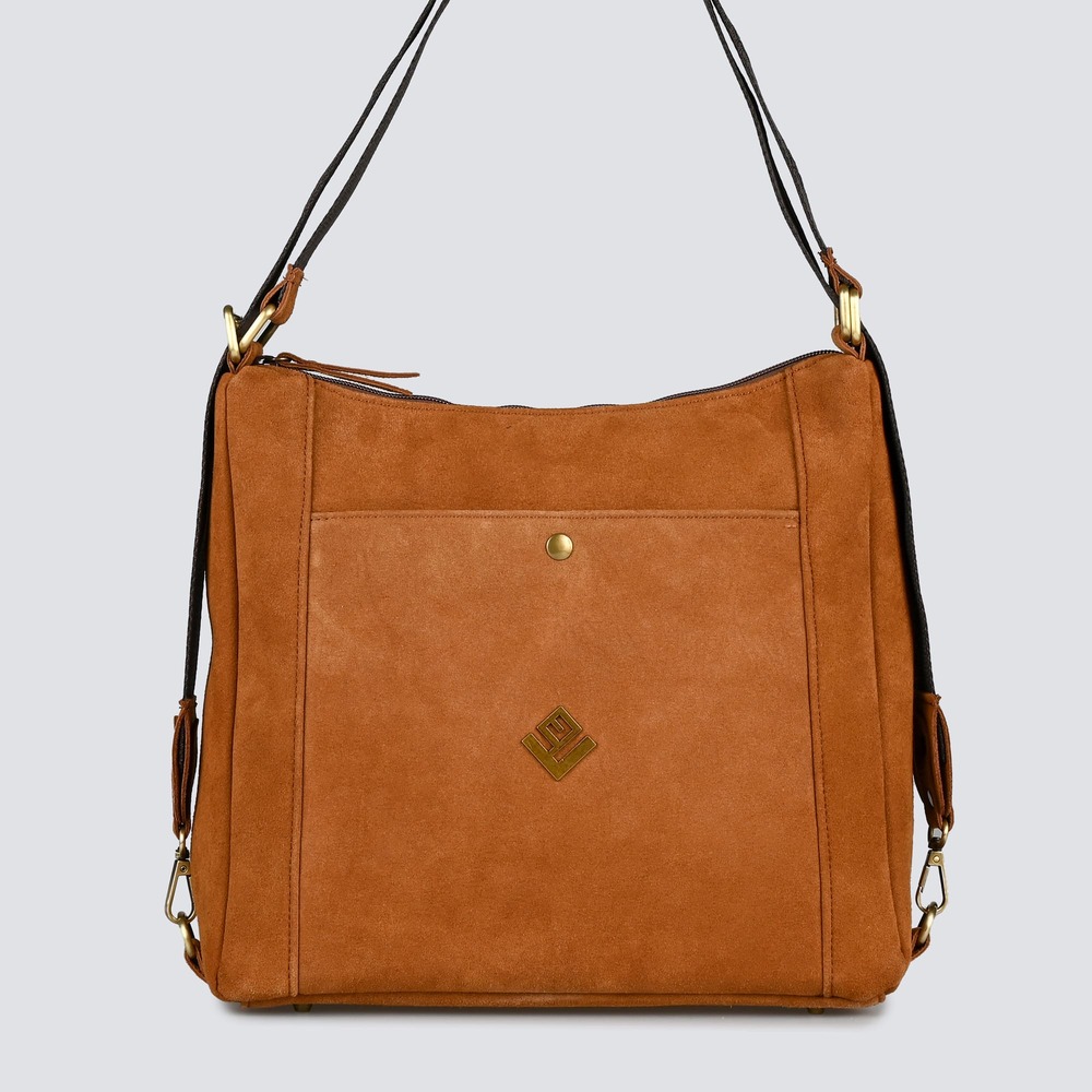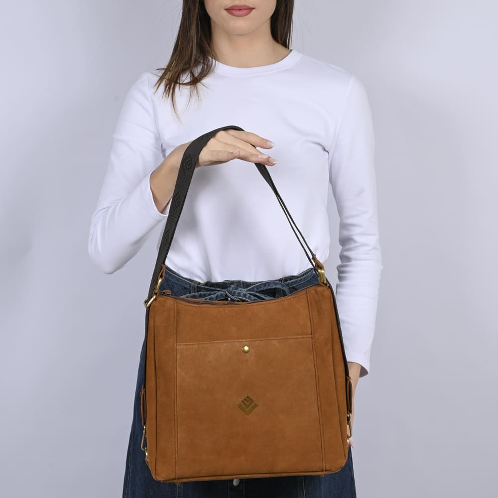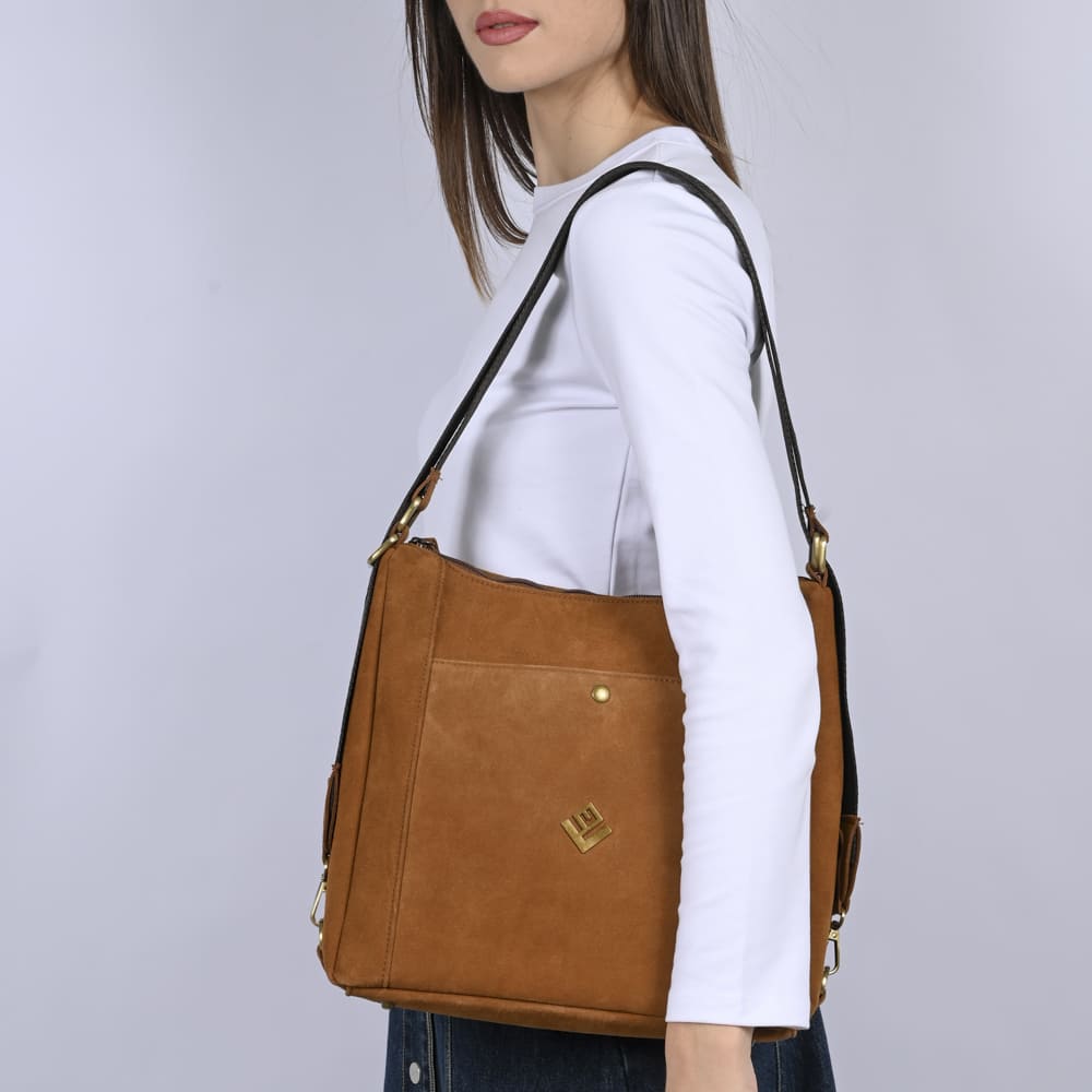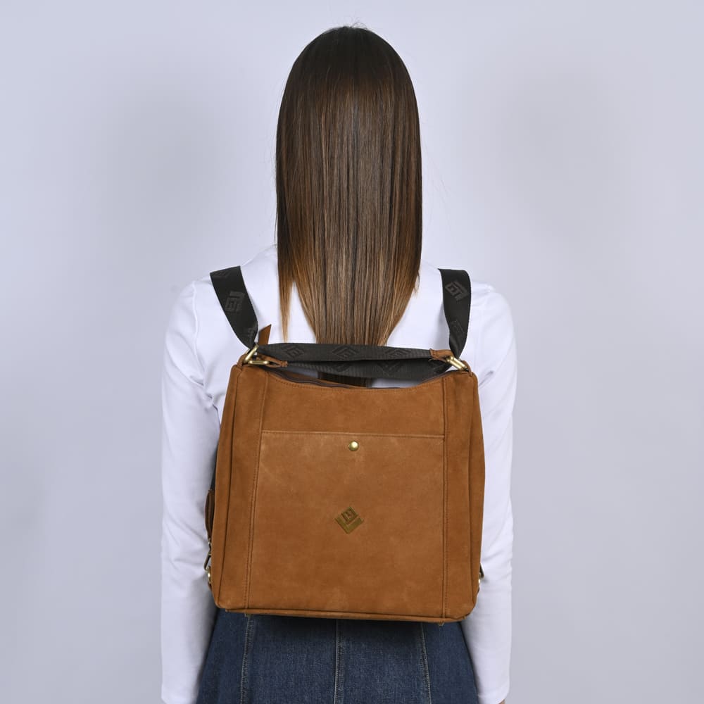 Σχεδιασμένη για ευελιξία, προσαρμόζεται στον ρυθμό της ημέρας, φοριέται στον ώμο, χιαστί ή ως backpack, προσφέροντας ελευθερία κινήσεων χωρίς να χάνει την αισθητική της ταυτότητα. Το εσωτερικό με υφασμάτινη φόδρα φιλοξενεί έναν ευρύχωρο χώρο με εσωτερική τσέπη που κλείνει με φερμουάρ και με πρακτική θήκη για κλειδιά, ενώ η εξωτερική τσέπη εξυπηρετεί την άμεση πρόσβαση στα essentials. Οι bronze μεταλλικές λεπτομέρειες λειτουργούν ως διακριτικό statement, ολοκληρώνοντας το σύνολο με χαρακτήρα.